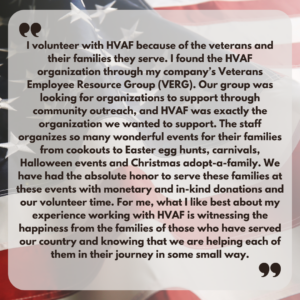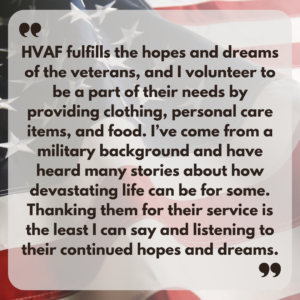 The volunteers who serve at HVAF help us perform such an important part of our mission. We could not operate the pantry, do beautification projects at our properties, or have events through the Veteran Engagement Committee, without them! Volunteering also provides an opportunity to have a shared experience with the veterans we serve and to witness the valuable work we do first-hand.