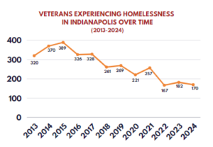 While there is some good news with the reduction in veteran homelessness, there remains much work to do to end veteran homelessness in Indianapolis. Comprehensive strategies are needed to address the lack of affordable housing, mental health and substance use crisis, and unemployment for the most vulnerable veterans in our community.