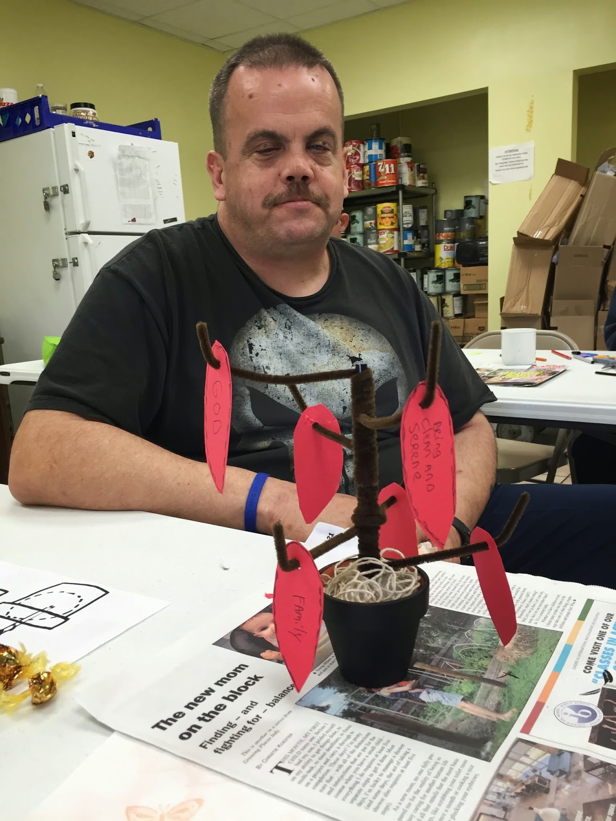 On the various leaves he has written: HVAF’s REST program, Back on My Feet, Family, God, Alcoholics Anonymous (AA), Being Clean and Serene. He will keep it by his bed and watch it grown by adding other things he is thankful for.